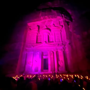 It involves walking the same 1.2km Siq route again (20 minutes each way). The Treasury area is transformed into a candlelit setting with seating at the front (chairs) and rugs behind.