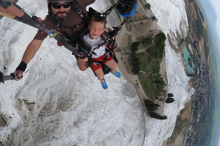 Pamukkale is famous for its white travertine terraces and thermal pools, but we wanted something more adventurous. After researching family-friendly tours in Turkey, we discovered that paragliding in Pamukkale is safe for children over 7.