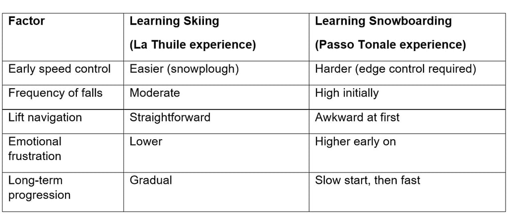 Snowboarding reset that progress temporarily. Shorter runs. Slower pace. More repetition. If you’re travelling during busy weeks, slope congestion makes this even more noticeable. Timing matters — especially when comparing resorts or school holiday periods. To read more about our experience in Passo Tonale read 👉 Is Passo Tonale Good for Families? Our Honest Half-Term Review with Kids