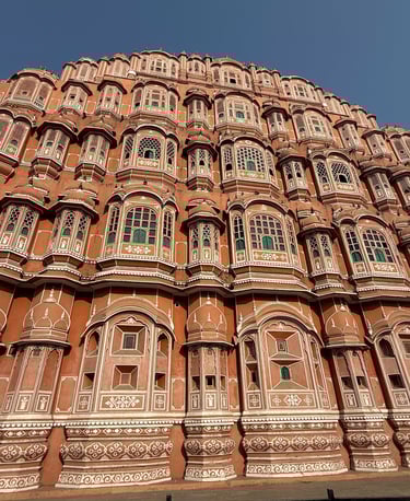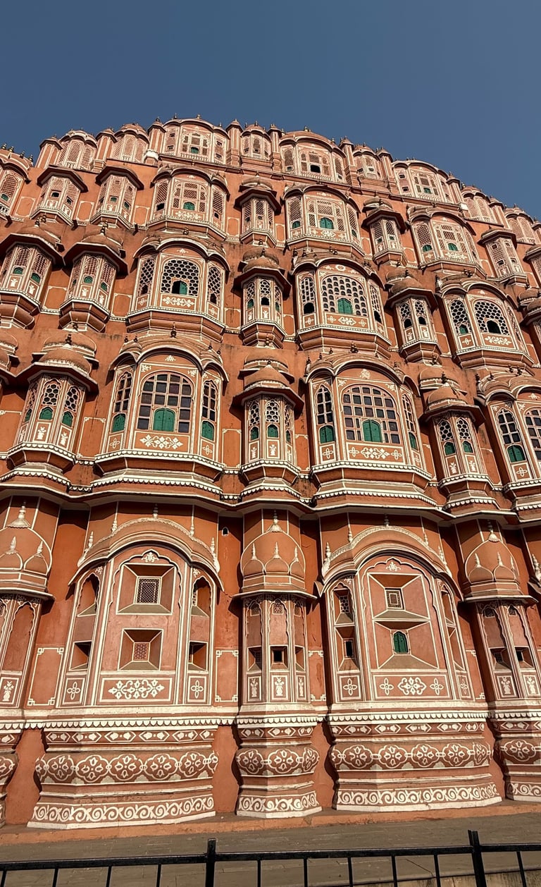Hawa Mahal — often called the “Palace of Winds” — is one of Jaipur’s most recognisable landmarks. Built in 1799, the five-storey pink sandstone façade is covered with hundreds of small lattice windows. These allowed royal women to observe daily life and processions in the street below without being seen, while still allowing cool air to circulate through the structure.